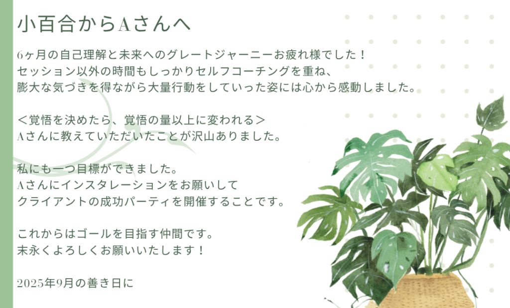 小百合さんとのコーチングの時間はとても楽しかったし、とても有意義な時間でした。