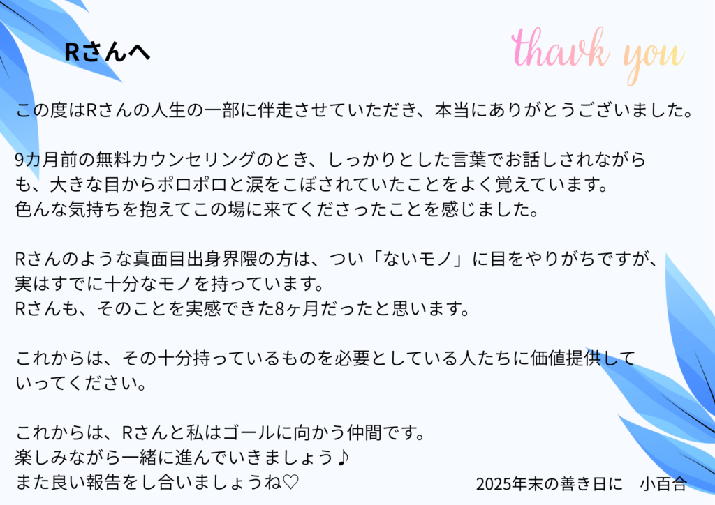 特に、ふと昔の感情に引き戻されそうになったとき、自分がどうなりたくてセッションを受けたか初心を確認できました。